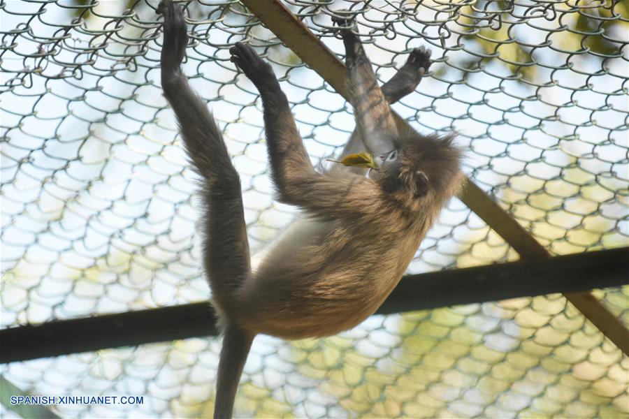 TRIPURA, diciembre 31, 2018 (Xinhua) -- Un mono juega en el Parque Zoológico Sepahijala en las afueras de Agartala, capital del estado de Tripura, en el noroeste de India, el 31 de diciembre de 2018. El Santuario de Vida Silvestre Sepahijala cubre un área de cerca de 5.07 kilómetros y es hogar de cuatro especies de mono primate, incluyendo el Langur de Phayre. (Xinhua/Str)