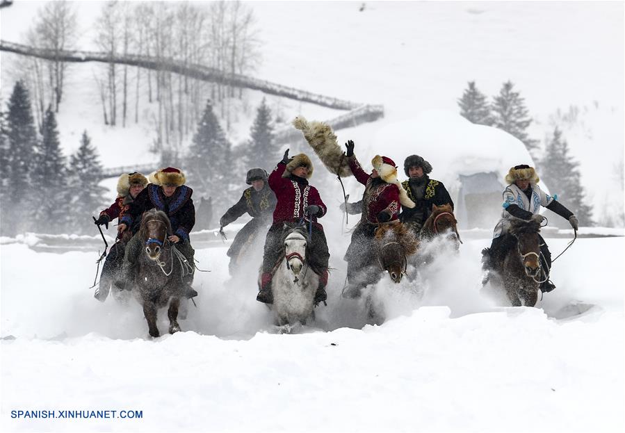 XINJIANG, enero 1, 2019 (Xinhua) -- Residentes participan en una carrera de caballos sobre la nieve, en la villa de Hemu de Kanas, en la Región Autónoma Uygur de Xinjiang, en el noroeste de China, el 1 de enero de 2018. Distintas actividades se llevaron a cabo en China para recibir el a?o 2019. (Xinhua/Zhao Ge)