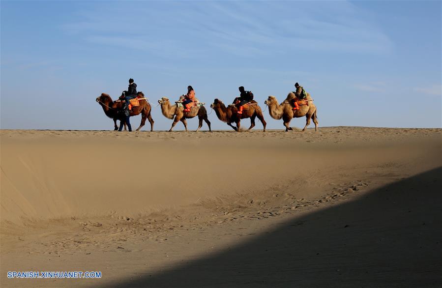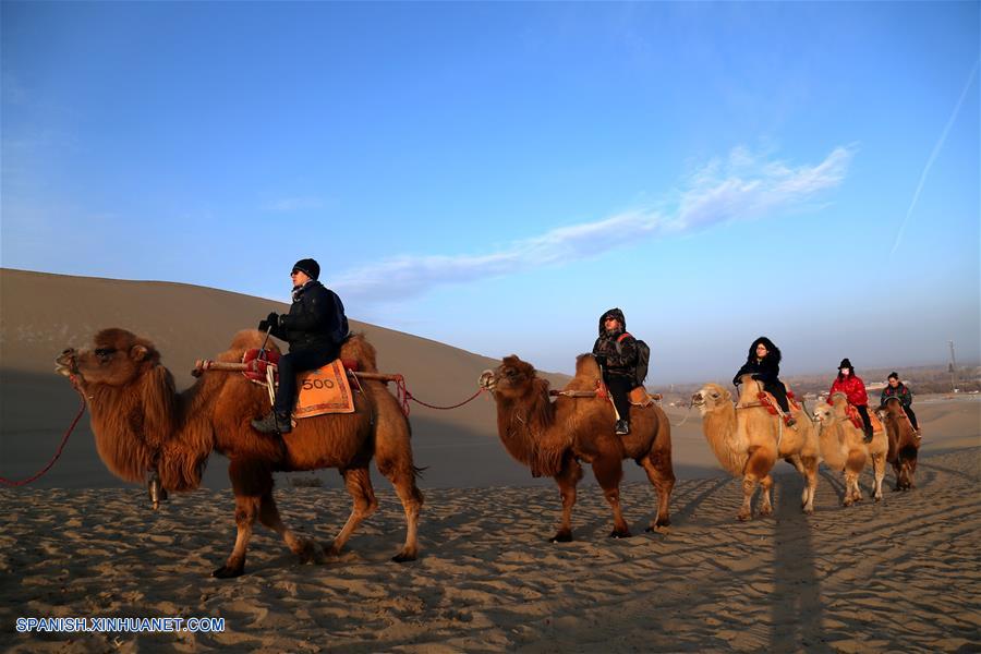 GANSU, enero 1, 2019 (Xinhua) -- Turistas viajan en camellos en el punto escénico del Manantial de la Media Luna en la Monta?a Mingsha, en Dunhuang, provincia de Gansu, en el noroeste de China, el 1 de enero de 2019. Distintas actividades se llevaron a cabo en China para recibir el a?o 2019. (Xinhua/Zhang Xiaoliang)