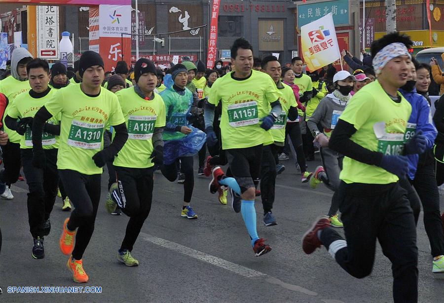 YINCHUAN, enero 1, 2019 (Xinhua) -- Personas participan en una carrera en Yinchuan, en la Región Autónoma Hui de Ningxia, en el noroeste de China, el 1 de enero de 2019. Distintas actividades se llevaron a cabo en China para recibir el a?o 2019. (Xinhua/Wu Xiaoyu)