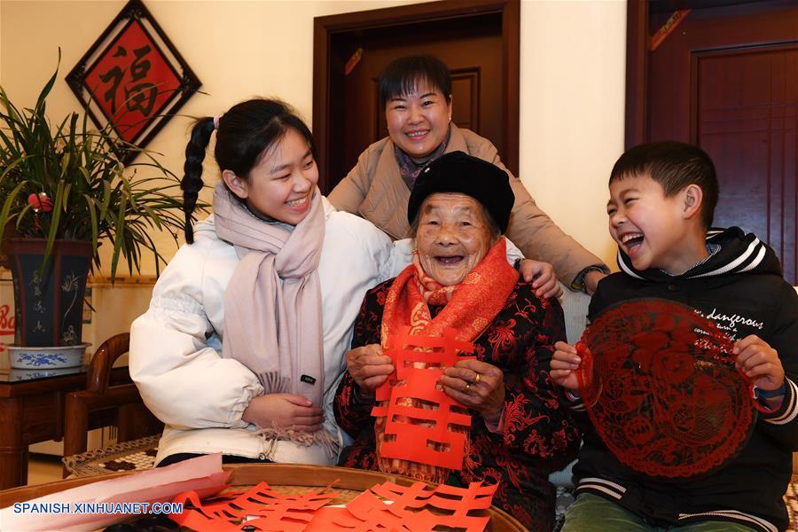 FUJIAN, enero 1, 2019 (Xinhua) -- La centenaria Peng Qianmei muestra el trabajo en papel cortado del caracter chino "Xi", que significa felicidad, en Wuyishan, en la provincia de Fujian, en el sureste de China, el 1 de enero de 2019. Distintas actividades se llevaron a cabo en China para recibir el a?o 2019. (Xinhua/Zhang Guojun)