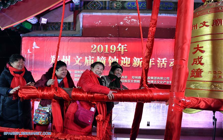 HENAN, enero 1, 2019 (Xinhua) -- Personas golpean una enorme campana para recibir el A?o Nuevo en Zhengzhou, capital de la provincia de Henan, en el centro de China, el 1 de enero de 2019. Varias actividades fueron organizadas por todo China para recibir el a?o 2019. (Xinhua/Li Jianan)