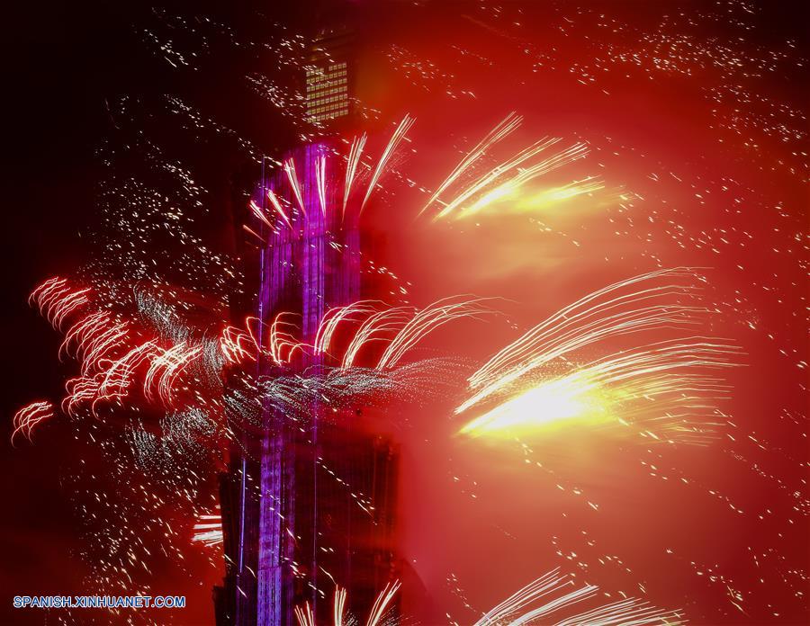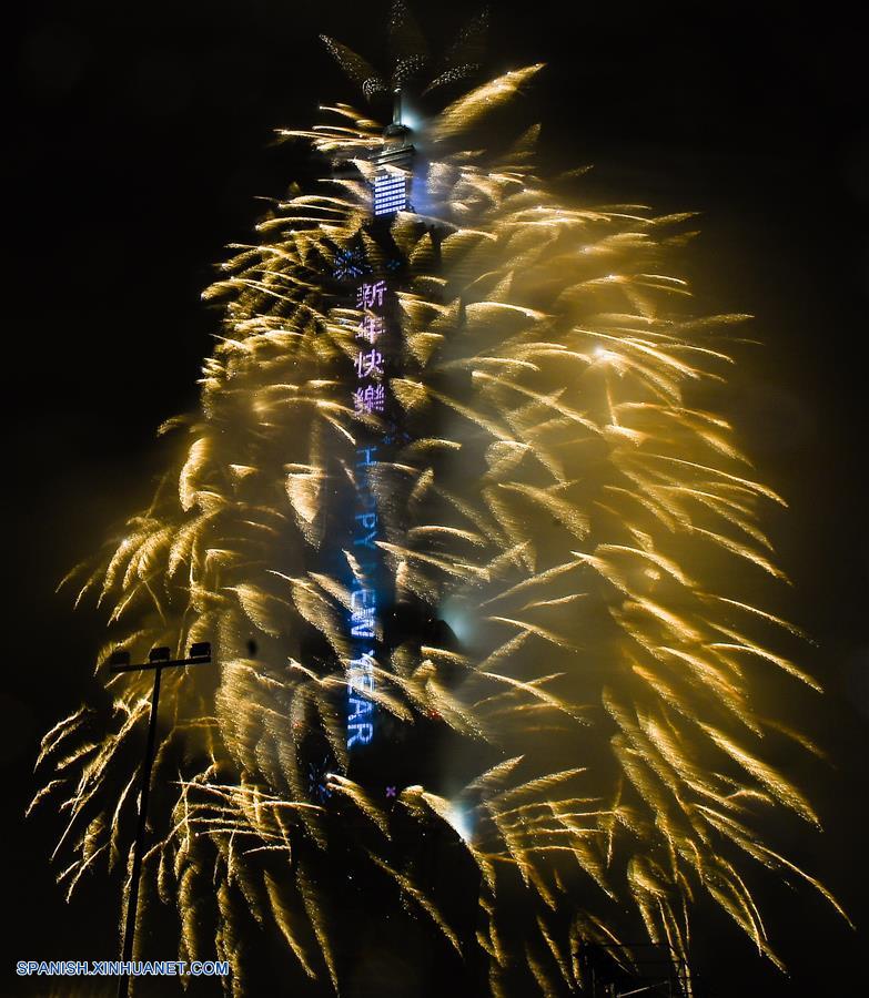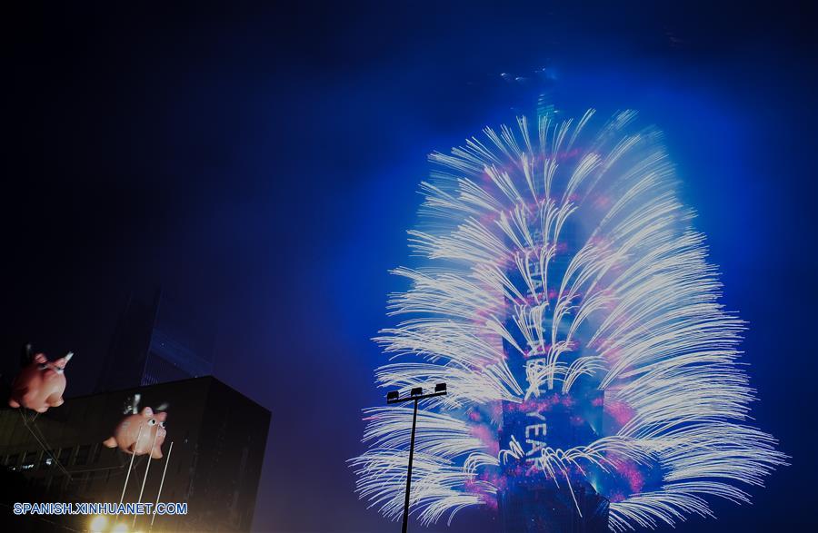 TAIPEI, enero 1, 2019 (Xinhua) -- Imagen del 31 de diciembre de 2018, de fuegos artificiales disparados desde el rascacielos Taipei 101 en Taiwán, en el sureste de China. Varias actividades fueron organizadas por todo China para recibir el a?o 2019. (Xinhua/Li Xiang)