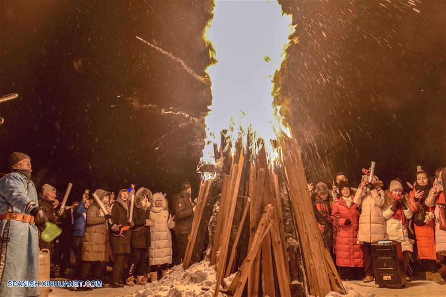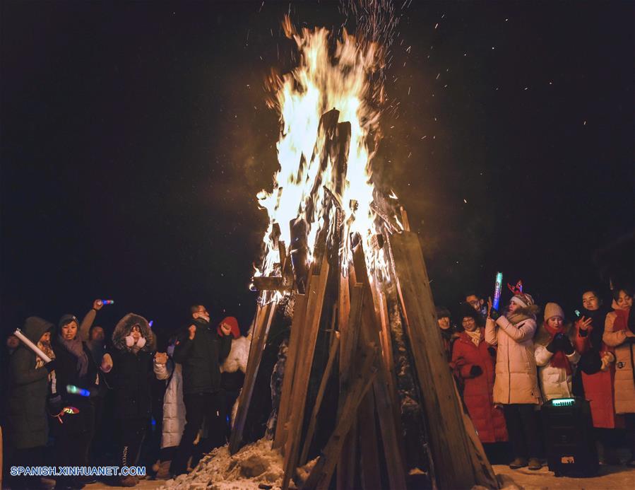 XINJIANG, enero 1, 2019 (Xinhua) -- Imahen del 31 de diciembre de 2018, de turistas celebrando en una fiesta con fogata la víspera de A?o Nuevo en la aldea Hemu de Kanas, en la Región Autónoma Uygur de Xinjiang, en el noroeste de China. Varias actividades fueron organizadas por todo China para recibir el a?o 2019. (Xinhua/Zhao Ge)