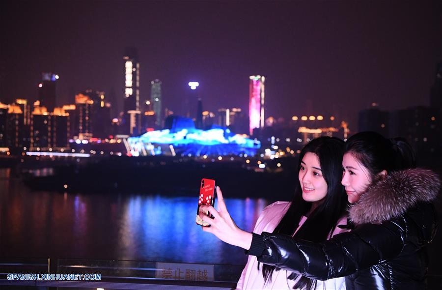 BEIJING, enero 1, 2019 (Xinhua) -- Residentes se toman una fotografía en la víspera de A?o Nuevo en Chongqing, en el suroeste, el 1 de enero de 2019. Varias actividades fueron organizadas por todo China para recibir el a?o 2019. (Xinhua/Wang Quanchao)