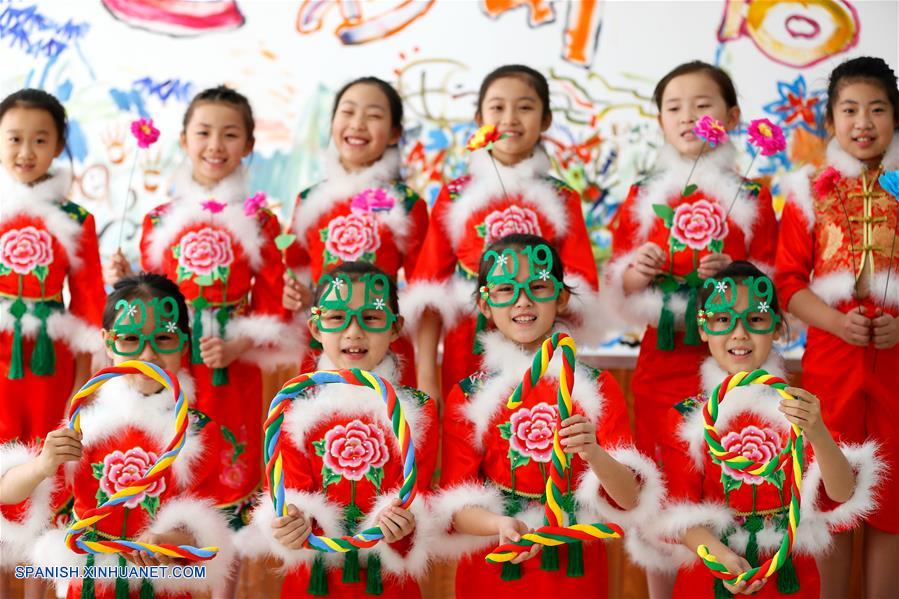 SHANDONG, enero 1, 2019 (Xinhua) -- Ni?os vestidos con trajes festivos posan para una foto grupal en Qingdao, en la provincia de Shandong, en el este de China, el 1 de enero de 2019. Distintas actividades se llevaron a cabo en China para recibir el a?o 2019. (Xinhua/Liang Xiaopeng)