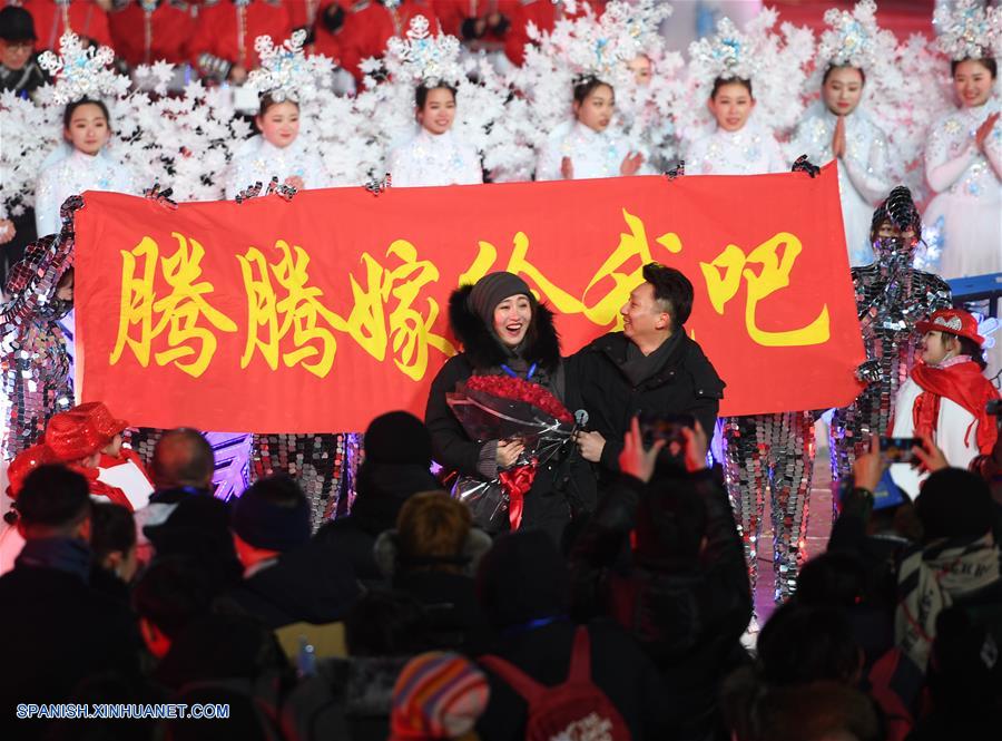 BEIJING, enero 1, 2019 (Xinhua) -- Una pareja reacciona después de una exitosa propuesta de matrimonio durante la ceremonia de apertura del "2019 Beijing New Year's Eve Countdown Celebration and Ice and Snow Cultural Tourism Festival" en el Parque Olímpico Verde en Beijing, capital de China, el 1 de enero de 2019. Distintas actividades se llevaron a cabo en China para recibir el a?o 2019. (Xinhua/Zhang Chenlin)