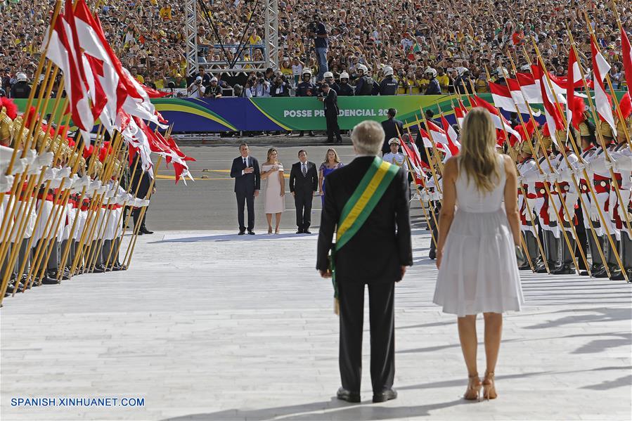 BRASILIA, enero 1, 2019 (Xinhua) -- Imagen proveída por AGENCIA ESTADO, del presidente saliente de Brasil, Michel Temer (i-frente), acompa?ado por su esposa, Marcela Temer (d-frente), recibiendo al presidente electo de Brasil, Jair Bolsonaro (i-atrás), en el Palacio de Planalto, en Brasilia, Brasil, el 1 de enero de 2019. Jair Bolsonaro, del Partido Social Liberal (PSL), juró el martes a las 15:10 hora local (17:10 GMT) como nuevo presidente de Brasil para un mandato de 4 a?os, en ceremonia realizada en el Congreso Nacional, en la ciudad de Brasilia. (Xinhua/Dida Sampaio/AGENCIA ESTADO)