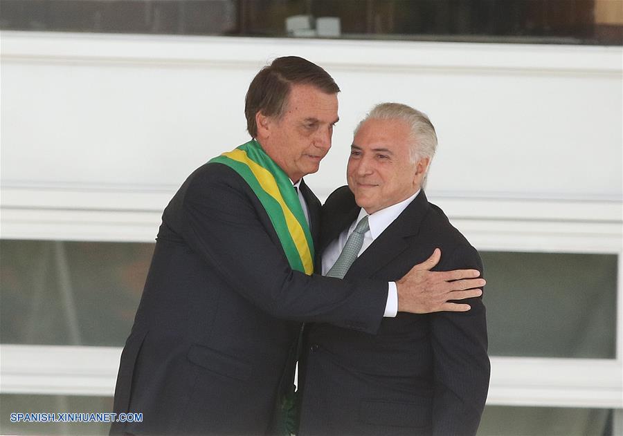 BRASILIA, enero 1, 2019 (Xinhua) -- Imagen proveída por AGENCIA ESTADO, del presidente saliente de Brasil, Michel Temer (d), felicitando al presidente de Brasil, Jair Bolsonaro (i), después de colocarle la banda presidencial, en el Palacio de Planalto, en Brasilia, Brasil, el 1 de enero de 2019. Jair Bolsonaro, del Partido Social Liberal (PSL), juró el martes a las 15:10 hora local (17:10 GMT) como nuevo presidente de Brasil para un mandato de 4 a?os, en ceremonia realizada en el Congreso Nacional, en la ciudad de Brasilia. (Xinhua/Célio Messias/AGENCIA ESTADO)