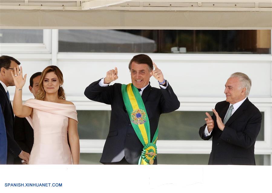 BRASILIA, enero 1, 2019 (Xinhua) -- Imagen proveída por AGENCIA ESTADO, del presidente de Brasil, Jair Bolsonaro (2-d), reaccionando después de recibir la banda presidencial de manos del ex presidente de Brasil, Michel Temer (d), en el Palacio de Planalto, en Brasilia, Brasil, el 1 de enero de 2019. Jair Bolsonaro, del Partido Social Liberal (PSL), juró el martes a las 15:10 hora local (17:10 GMT) como nuevo presidente de Brasil para un mandato de 4 a?os, en ceremonia realizada en el Congreso Nacional, en la ciudad de Brasilia. (Xinhua/Célio Messias/AGENCIA ESTADO)