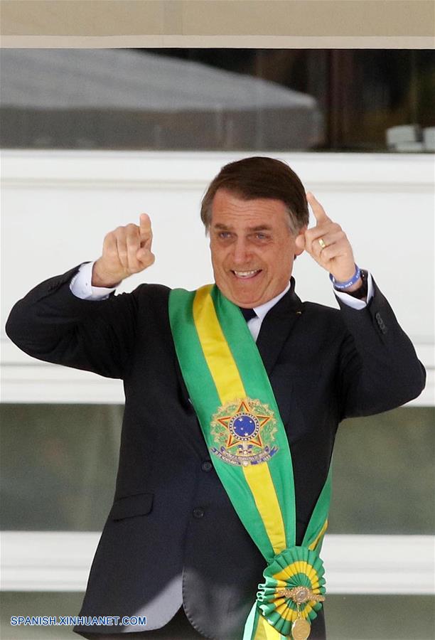 BRASILIA, enero 1, 2019 (Xinhua) -- Imagen proveída por AGENCIA ESTADO, del presidente de Brasil, Jair Bolsonaro, reaccionando después de recibir la banda presidencial de manos del presidente saliente de Brasil, Michel Temer, en el Palacio de Planalto, en Brasilia, Brasil, el 1 de enero de 2019. Jair Bolsonaro, del Partido Social Liberal (PSL), juró el martes a las 15:10 hora local (17:10 GMT) como nuevo presidente de Brasil para un mandato de 4 a?os, en ceremonia realizada en el Congreso Nacional, en la ciudad de Brasilia. (Xinhua/Célio Messias/AGENCIA ESTADO)