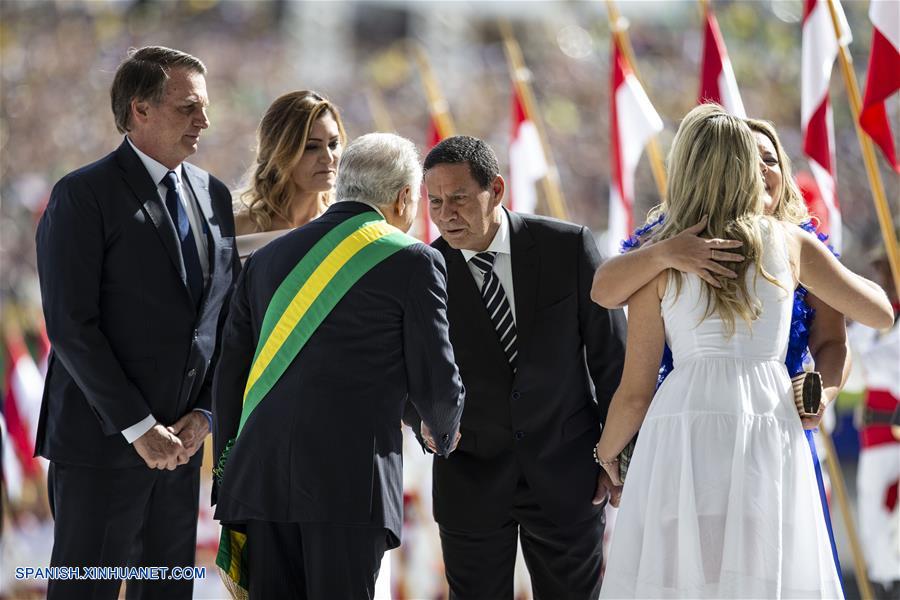 BRASILIA, enero 1, 2019 (Xinhua) -- El presidente de Brasil, Michel Temer (3-i), estrecha la mano con el vicepresidente brasile?o, Hamilton Mourao (3-d), en presencia del presidente electo de Brasil, Jair Bolsonaro (i), previo a la ceremonia de transmisión de mando, en el Palacio de Planalto, en Brasilia, Brasil, el 1 de enero de 2019. Jair Bolsonaro, del Partido Social Liberal (PSL), juró el martes a las 15:10 hora local (17:10 GMT) como nuevo presidente de Brasil para un mandato de 4 a?os, en ceremonia realizada en el Congreso Nacional, en la ciudad de Brasilia. (Xinhua/Li Ming)