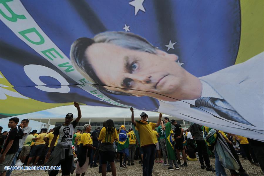 BRASILIA, enero 1, 2019 (Xinhua) -- Imagen proveída por AGENCIA ESTADO, de personas reaccionando previo a la ceremonia de toma de posesión del presidente electo de Brasil, Jair Bolsonaro, en las inmediaciones del Palacio del Planalto, en Brasilia, Brasil, el 1 de enero de 2019. Un fuerte esquema de seguridad acompa?ará la toma de posesión de Jair Bolsonaro como presidente de Brasil por un mandato de cuatro a?os, con la presencia de más de 3,200 agentes, aviones de combate y misiles antiaéreos. (Xinhua/Wilton Junior/AGENCIA ESTADO)