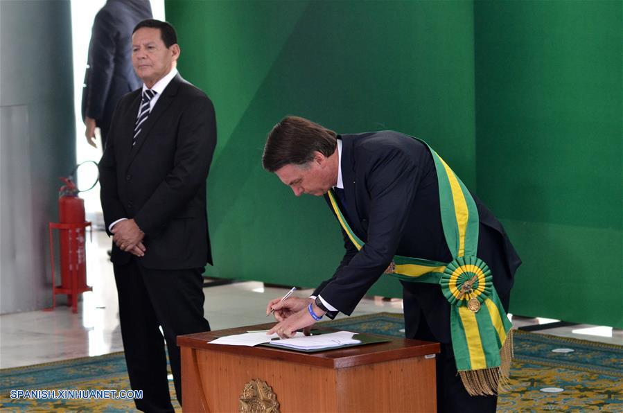 BRASILIA, enero 1, 2019 (Xinhua) -- Imagen proveída por AGENCIA ESTADO del presidente de Brasil, Jair Bolsonaro (d), firmando las actas de su toma de posesión, en el Palacio de Planalto, en Brasilia, Brasil, el 1 de enero de 2019. Jair Bolsonaro, del Partido Social Liberal (PSL), juró el martes a las 15:10 hora local (17:10 GMT) como nuevo presidente de Brasil para un mandato de 4 a?os, en ceremonia realizada en el Congreso Nacional, en la ciudad de Brasilia. (Xinhua/Renato Costa/FRAMEPHOTO/AGENCIA ESTADO)