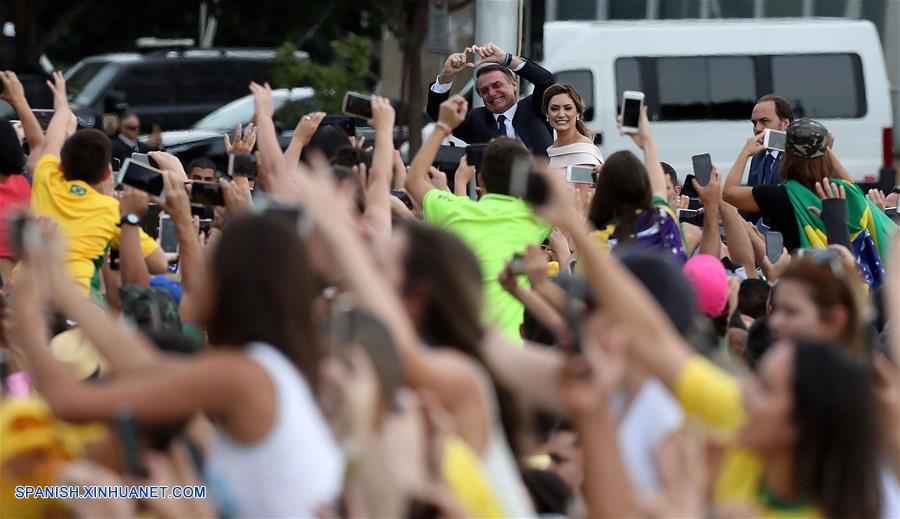 BRASILIA, enero 1, 2019 (Xinhua) -- Imagen proveída por AGENCIA ESTADO, del presidente electo de Brasil, Jair Bolsonaro (i-atrás), acompa?ado por su esposa Michelle Bolsonaro (d-atrás) reaccionando a su llegada al Congreso Nacional, en Brasilia, Brasil, el 1 de enero de 2019. Jair Bolsonaro, del Partido Social Liberal (PSL), juró el martes a las 15:10 hora local (17:10 GMT) como nuevo presidente de Brasil para un mandato de 4 a?os, en ceremonia realizada en el Congreso Nacional, en la ciudad de Brasilia. (Xinhua/Gabriela Biló/AGENCIA ESTADO)