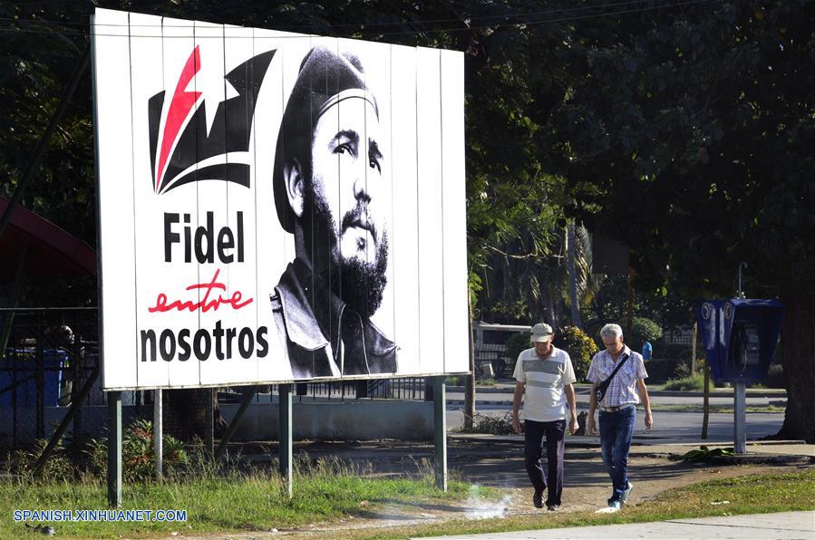 LA HABANA, enero 1, 2019 (Xinhua) -- Imagen del 30 de diciembre de 2018 de dos personas caminando frente a un cartel con la imagen del fallecido líder histórico de la Revolución Cubana, Fidel Castro, en una calle de la localidad del Vedado en el Municipio Plaza de la Revolución, en La Habana, Cuba. Hace exactamente 60 a?os triunfó la Revolución Cubana, hecho que desde entonces y hasta hoy en día, marca pauta como fenómeno transformador causante de admiración o antipatía, pero ante el cual nadie es indiferente. El 1 de enero de 1959, en la oriental ciudad de Santiago de Cuba, el desaparecido líder Fidel Castro anunció la victoria, transitando por la adopción de medidas para algunos utópicas, que entregaron tierras a los campesinos, alfabetizaron a millones de personas y beneficiaron en general al pueblo. (Xinhua/Joaquín Hernández)