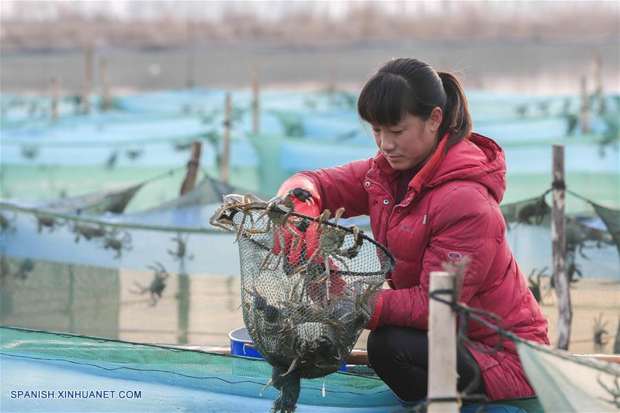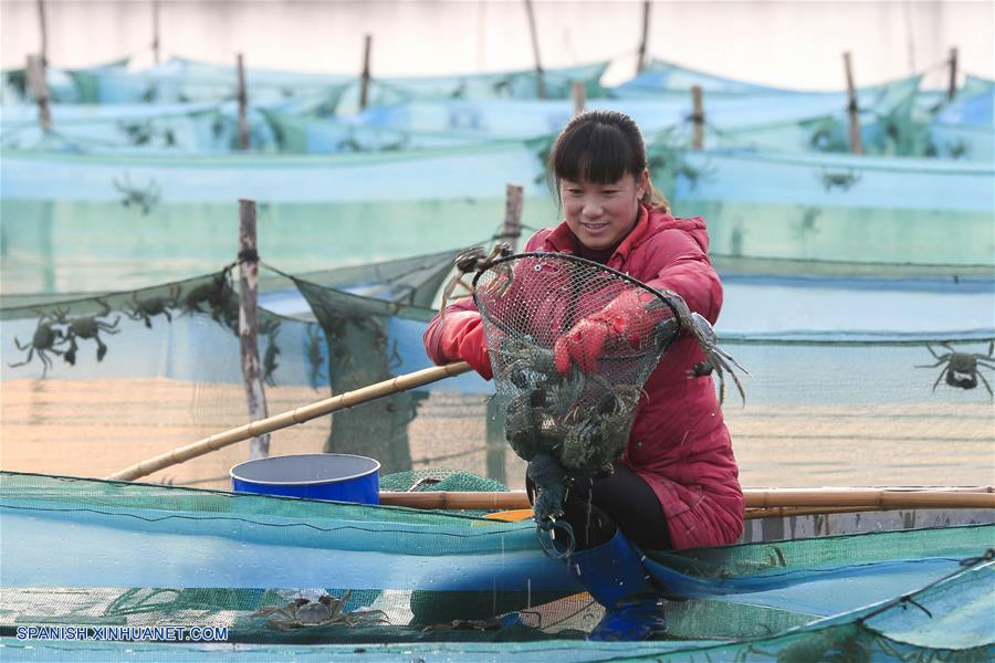 JIANGSU, enero 1, 2019 (Xinhua) -- Hua Hongxia cría cangrejos de Shanghai en su granja de jaulas en la aldea de Zhouhu, del condado Xuyi, de la provincia de Jiangsu, en el este de China, el 1 de enero de 2019. Hua Hongxia solía ser una aldeana afectada por la pobreza en Zhouhu. En a?os recientes, el gobierno local ha llevado a cabo métodos efectivos para el alivio de la pobreza, ayudando a Hua a desarrollar una industria de cultivo de cangrejos y eliminar la pobreza. (Xinhua/Zhou Haijun)