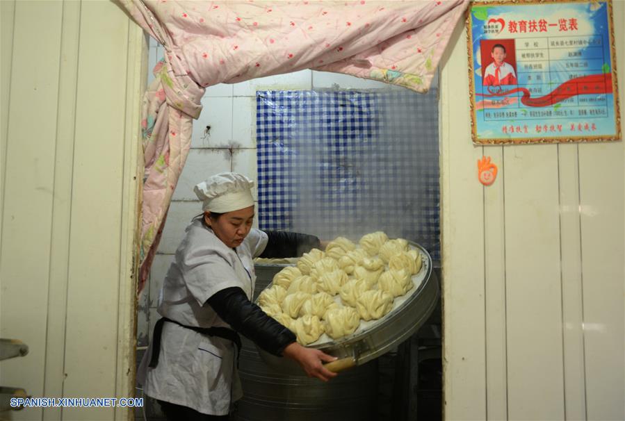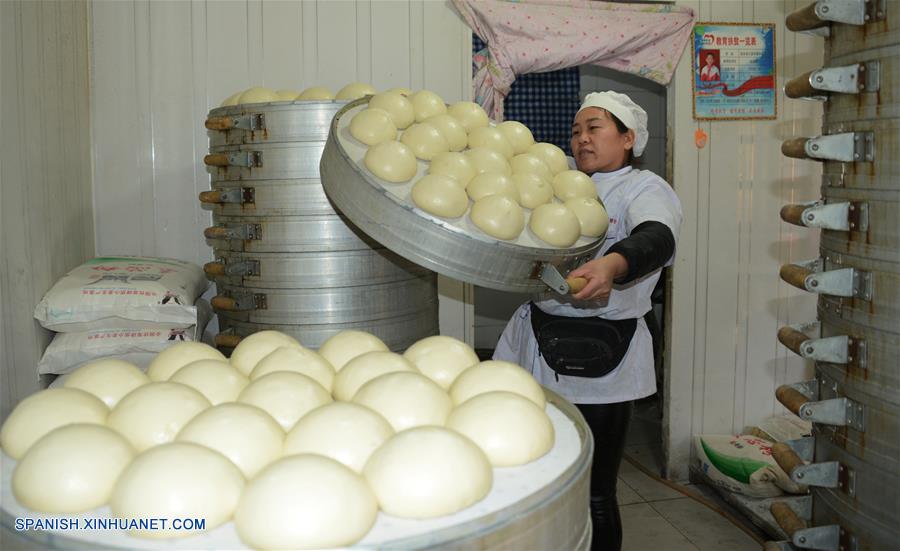 SHAANXI, enero 1, 2019 (Xinhua) -- El aldeano Duan Junmei hornea pan al vapor chino en su tienda en un mercado en el condado Yanchang, en la provincia de Shaanxi, en el noroeste de China, el 1 de enero de 2019. Duan Junmei era un aldeano afectado por la pobreza en Yanchang. En a?os recientes, el gobierno local ha llevado a cabo métodos efectivos para el alivio de la pobreza, ayudando a Duan a abrir una tienda de pan de vapor y eliminar la pobreza. (Xinhua/Wang Fujian)