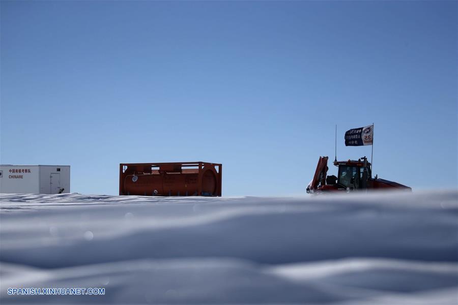 ANTARTIDA, enero 1, 2019 (Xinhua) -- Vista aérea de vehículos de la 35 Expedición Antártica de China en su campamento en Antártida. El equipo de expedición, que se esperaba llegar a la Estación Kunlun en cinco días, a aproximadamente 4,000 metros sobre el nivel de mar cerca del Domo A, entró en la Meseta de Antártida el lunes. (Xinhua/Liu Shiping)