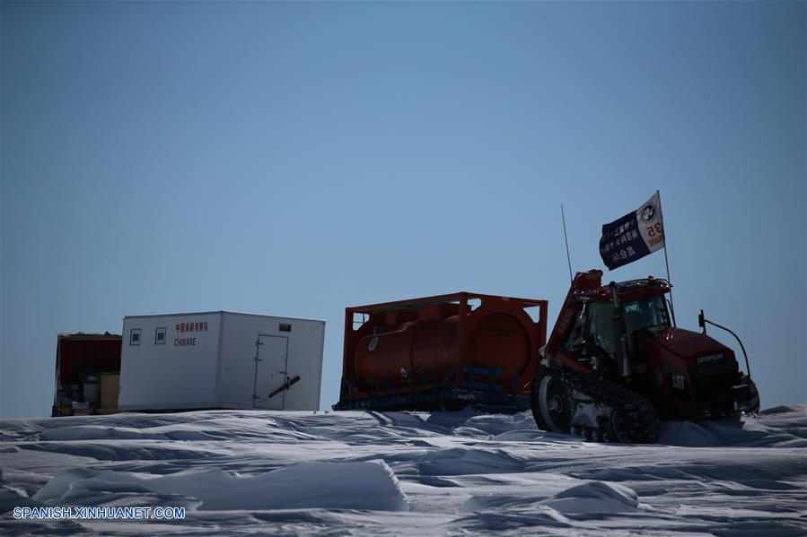 ANTARTIDA, enero 1, 2019 (Xinhua) -- Imagen del 31 de diciembre de 2018, de un tractor del equipo de la 35 Expedición Antártica de China avanzando entre montículos de hielo en Antártida. El equipo de expedición, que se espera llegue a la Estación Kunlun en cinco días, a aproximadamente 4,000 metros sobre el nivel de mar cerca del Domo A, entró en la Meseta de Antártida el lunes. (Xinhua/Liu Shiping)