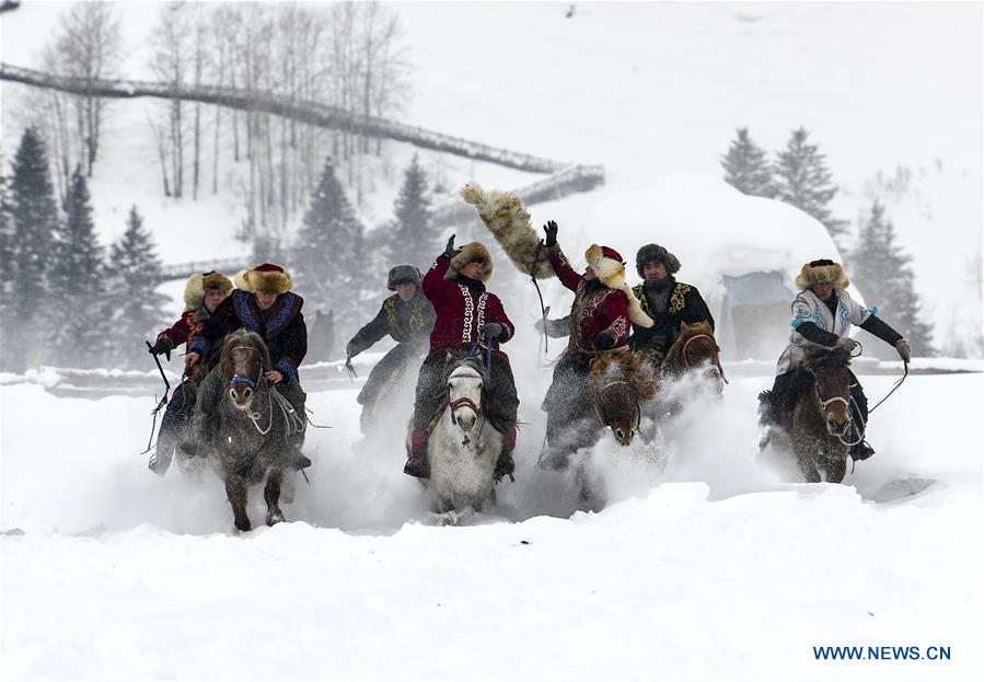 Carrera de caballos durante el Festival del Hielo y la Nieve en la aldea Hemu de Kanas, Región Autónoma de Xinjiang Uygur, el 1 de enero del 2019. En toda China, se celebraron actividades en saludo al a?o nuevo. (Foto: Xinhua/ Zhao Ge)