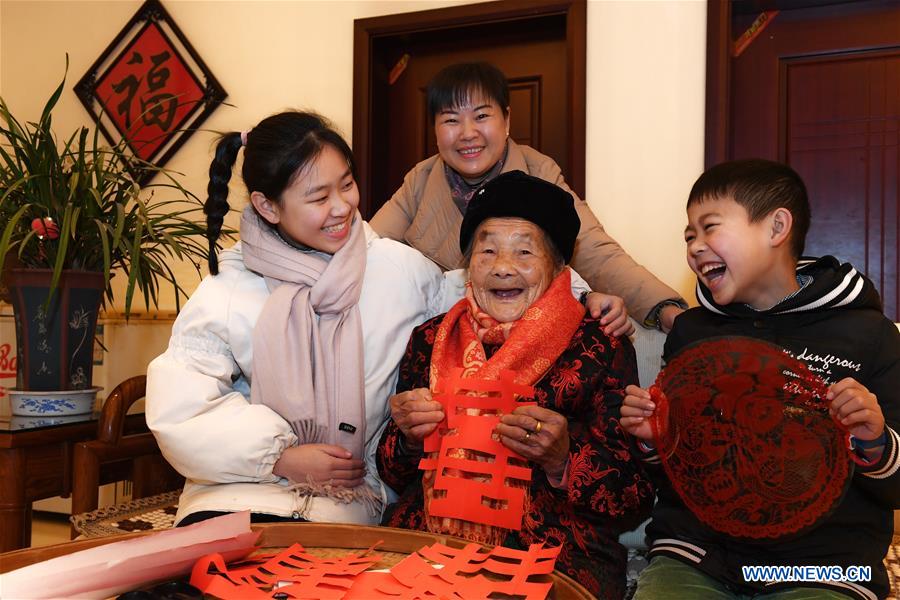 La centenaria Peng Qianmei muestra su recorte de papel con el caracter chino "Xi", que significa felicidad. Peng reside en Wuyishan, provincia de Fujian, el 1 de enero del 2019. En toda China, se celebraron actividades en saludo al a?o nuevo. (Foto: Xinhua/ Zhang Guojun)