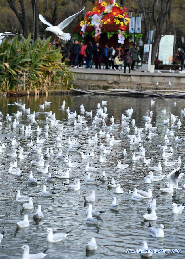 YUNNAN, enero 1, 2019 (Xinhua) -- Turistas observan las gaviotas de cabeza negra en el parque Daguan, en Kunming, capital de la provincia de Yunnan, en el suroeste de China, el 1 de enero de 2019. Las gaviotas de cabeza negra se convierten en una atracción para los turistas durante las vacaciones de A?o Nuevo. (Xinhua/Lin Yiguang)
