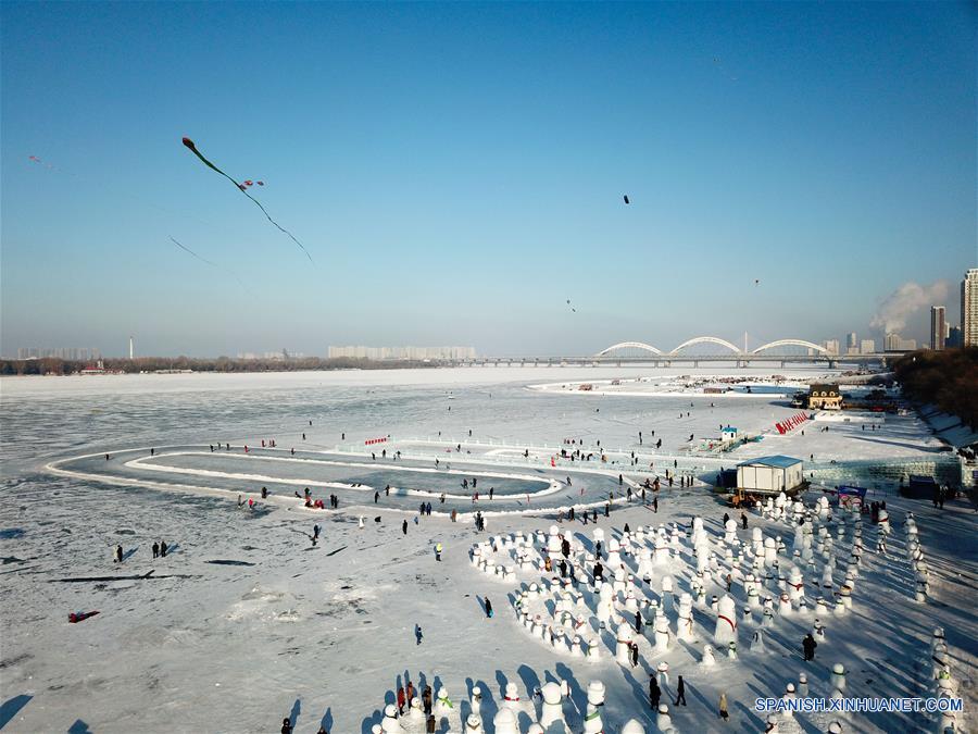 HEILONGJIANG, enero 2, 2019 (Xinhua) -- Vista aérea de personas observando esculturas de mu?ecos de nieve en la orilla del río Songhua, en Harbin, capital de la provincia de Heilongjiang, en el noreste de China, el 2 de enero de 2019. En total 2,019 mu?ecos de nieve fueron exhibidos en el lugar para recibir el a?o 2019. (Xinhua/Wang Song)