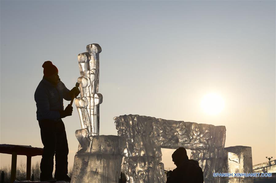 HEILONGJIANG, enero 2, 2019 (Xinhua) -- Una persona talla una escultura de hielo durante un concurso internacional de escultura de hielo, en Harbin, capital de la provincia de Heilongjiang, en el noreste de China, el 2 de enero de 2019. Un total de 16 equipos de 12 países y regiones participaron en el evento. (Xinhua/Wang Jianwei)