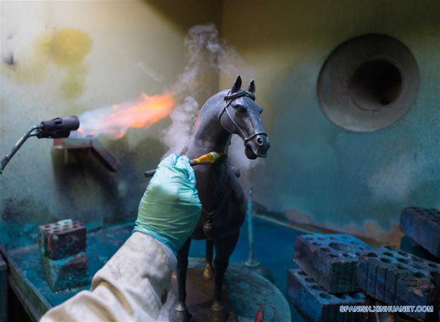 ZHEJIANG, enero 2, 2019 (Xinhua) -- Un artesano elabora modelos de caballo de cobre en el taller de una fábrica, en la ciudad de Jiande, provincia de Zhejiang, en el este de China, el 2 de enero de 2019. La empresa de producción de artículos sanitarios tradicionales, Tong Shifu, que significa maestro del cobre, se ha convertido en una empresa que dise?a y fabrica obras de arte de cobre en colaboración con un museo, una firma de dibujos animados y un estudio de artista. Con la producción anual alcanzando los 500 millones de yuanes (aproximadamente 72.9 millones de dólares estadounidenses), la campa?ía ha tenido éxito en la tranformación industrial. (Xinhua/Weng Xinyang)