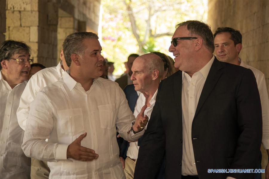 Imagen cedida por la Presidencia de Colombia, del presidente colombiano, Iván Duque (i-frente), conversando con el secretario de Estado de Estados Unidos, Mike Pompeo (d-frente), durante su reunión en Cartagena, Colombia, el 2 de enero de 2019. De acuerdo con información de la prensa local, Iván Duque se reunió el miércoles con el secretario de Estado de Estados Unidos, Mike Pompeo, con quien acordó fortalecer la relación bilateral y continuar el apoyo estadounidense de la agenda de legalidad que impulsa su gobierno. (Xinhua/Presidencia de Colombia)