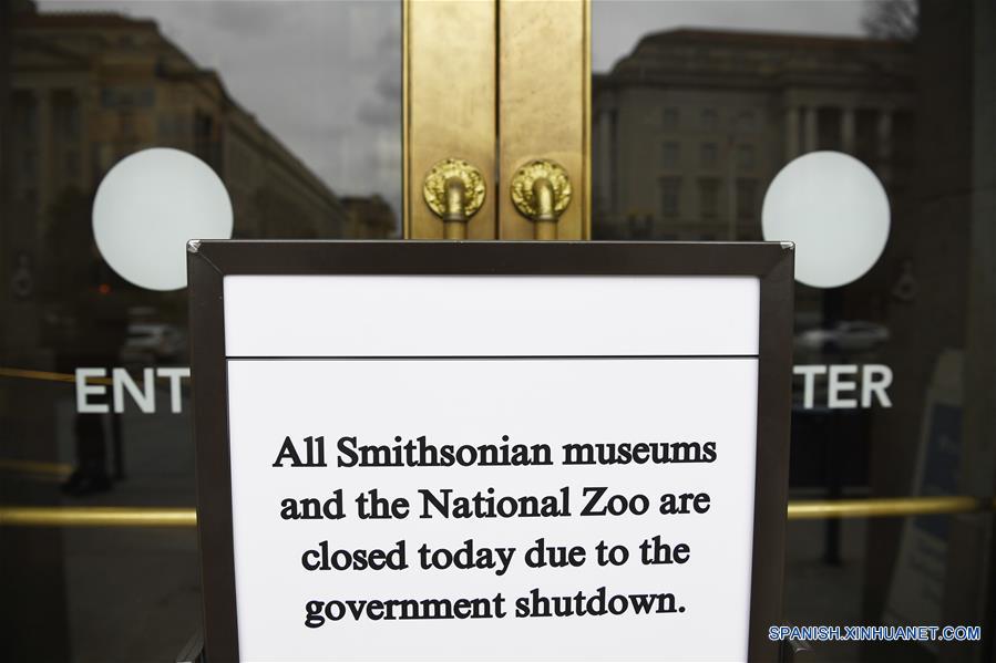 Un cartel anunciando el cierre del Museo Nacional Smithsoniano de Historia Nataural es exhibido en su entrada, en Washignton D.C., Estados Unidos, el 2 de enero de 2019. De acuerdo con información de la prensa local, los 19 museos Smithsonianos y el Zoológico Nacional en Washington D.C. cerraron sus puertas el miércoles, conforme el cierre parcial del gobierno de Estados Unidos se prolonga. (Xinhua/Liu Jie)