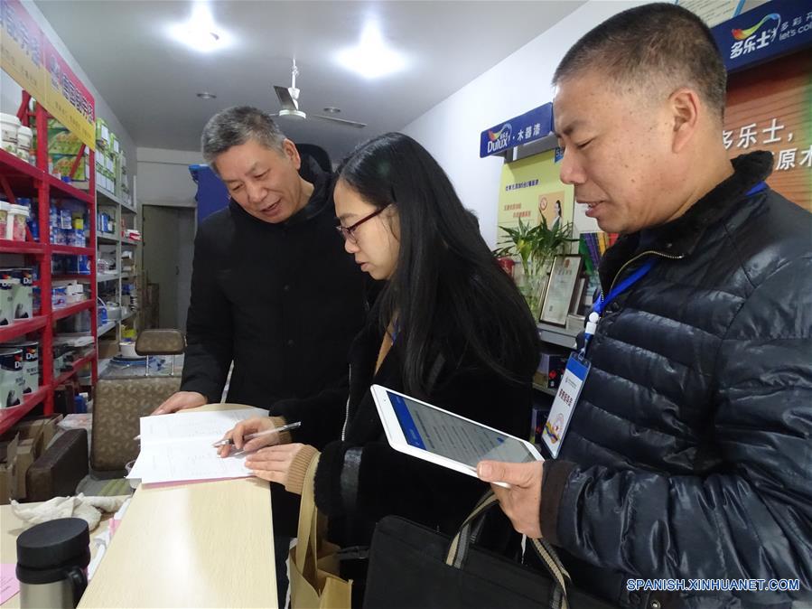 Imagen del 1 de enero de 2019 de trabajadores del censo registrando información de una persona de negocios, en la localidad de Ruoheng de la ciudad de Wenling, provincia de Zhejiang, en el este de China. El cuarto censo económico nacional de China entró el martes en su etapa de registro. El censo, realizado cada cinco a?os, abarcará a todas las empresas involucradas en las industrias secundaria y terciaria, para ofrecer un amplio panorama económico. China ha llevado a cabo tres censos económicos nacionales previamente: en 2004, 2008 y 2013. (Xinhua/Jiang Lianqiu)