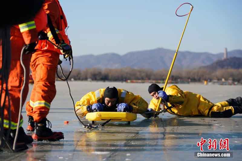 Los rescatistas realizan un simulacro de emergencia en la pista de hielo del Lago Kunming, ubicada en el Palacio de Verano de Beijing. 30 de diciembre del 2018. [Foto: Chinanews. com]