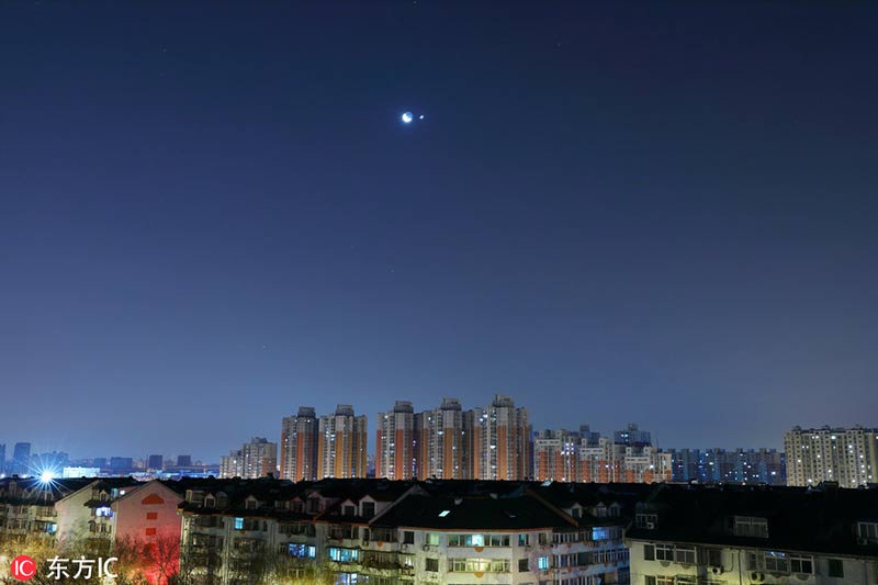 Temprano en la ma?ana, la Luna entró en conjunción con Venus. El cielo en el distrito de Shijingshan, en Beijing, fue privilegiado escenario para observar la esperada conjunción de la Luna y el planeta Venus. Después de las 5:00 de la ma?ana, los dos objetos estelares comenzaron a ser visibles en dirección sureste.Su máxima aproximación ocurrió a las 22:00 UTC del día primero de enero. La conjunción, que se puede apreciar desde cualquier país y a simple vista, tiene al planeta Júpiter y a la estrella Antares como testigos, 2 de enero del 2019. [Foto: IC]