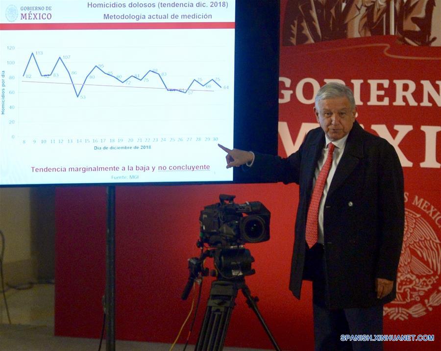 CIUDAD DE MEXICO, enero 3, 2019 (Xinhua) -- Imagen proveída por la agencia Obturador MX, del presidente de México, Andrés Manuel López Obrador, participando durante una conferencia de prensa matutina, en Palacio Nacional, en la Ciudad de México, capital de México, el 3 de enero de 2019. De acuerdo con información de la prensa local, el presidente mexicano, Andrés Manuel López Obrador, admitió el jueves que la seguridad en el país aún es un problema importante, dando a conocer las cifras preliminares de homicidios en México e indicó que todos los funcionarios de la presente administración deberán hacer pública su declaración de bienes. (Xinhua/Alessa Mejía/Obturador MX)