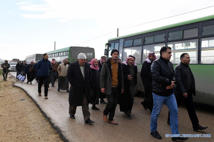 Desplazados sirios esperan en el cruce de Tayha en el área rural de la ciudad de Manbij, en el norte de Siria, el 3 de enero de 2019. La calma prevalece en la ciudad de Manbij, norte de Siria, en medio del retiro consecutivo de cientos de rebeldes apoyados por Turquía de sus alrededores, informó el jueves un grupo de observadores del conflicto. (Xinhua/Str)