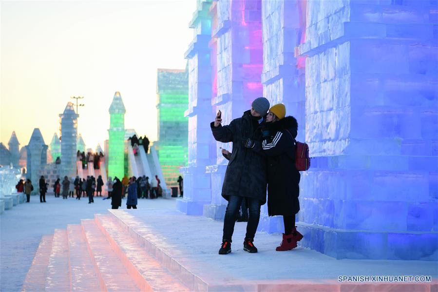 Turistas se toman "selfies" en el Mundo de Hielo y Nieve, en Harbin, capital de la provincia de Heilongjiang, en el noreste de China, el 5 de enero de 2019. El 35 Festival Internacional de Hielo y Nieve de Harbin comenzó el sábado. (Xinhua/Wang Song)