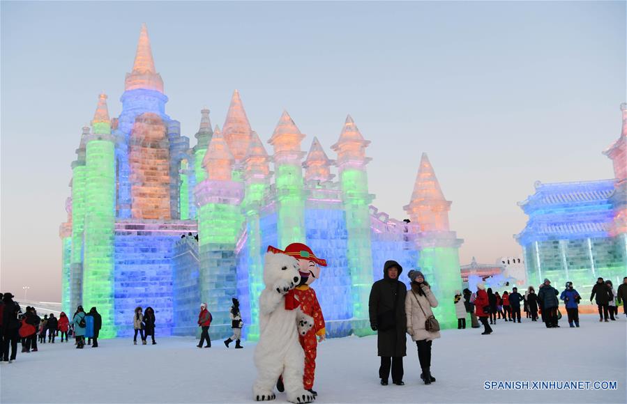Turistas visitan el Mundo de Hielo y Nieve, en Harbin, capital de la provincia de Heilongjiang, en el noreste de China, el 5 de enero de 2019. El 35 Festival Internacional de Hielo y Nieve de Harbin comenzó el sábado. (Xinhua/Wang Song)