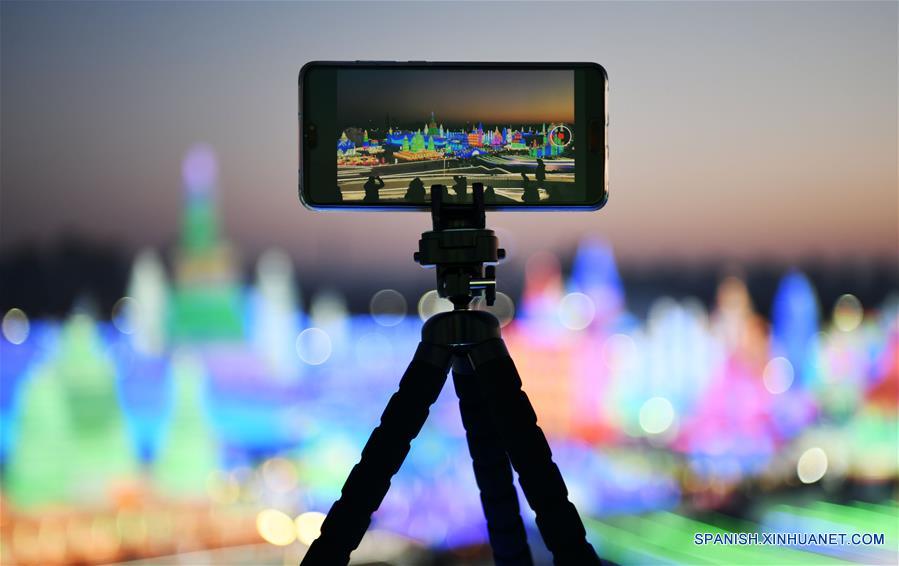 Un turista toma una fotografía del Mundo de Hielo y Nieve, en Harbin, capital de la provincia de Heilongjiang, en el noreste de China, el 5 de enero de 2019. El 35 Festival Internacional de Hielo y Nieve de Harbin comenzó el sábado. (Xinhua/Wang Jianwei)