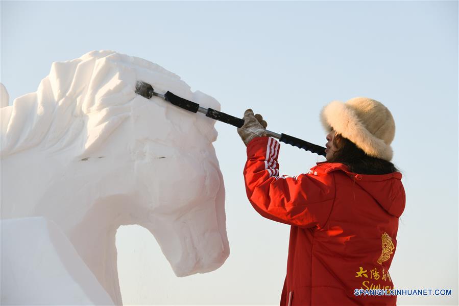 Un participante elabora una escultura de nieve en el Parque Internacional de Exposiciones de Arte de Escultura de Nieve Isla del Sol, en Harbin, provincia de Heilongjiang, en el noreste de China, el 6 de enero de 2019. Un concurso de esculturas de nieve de cuatro días de duración de estudiantes universitarios fue inaugurado el viernes, atrayendo a 70 participantes de 17 universidades de China. (Xinhua/Wang Song)