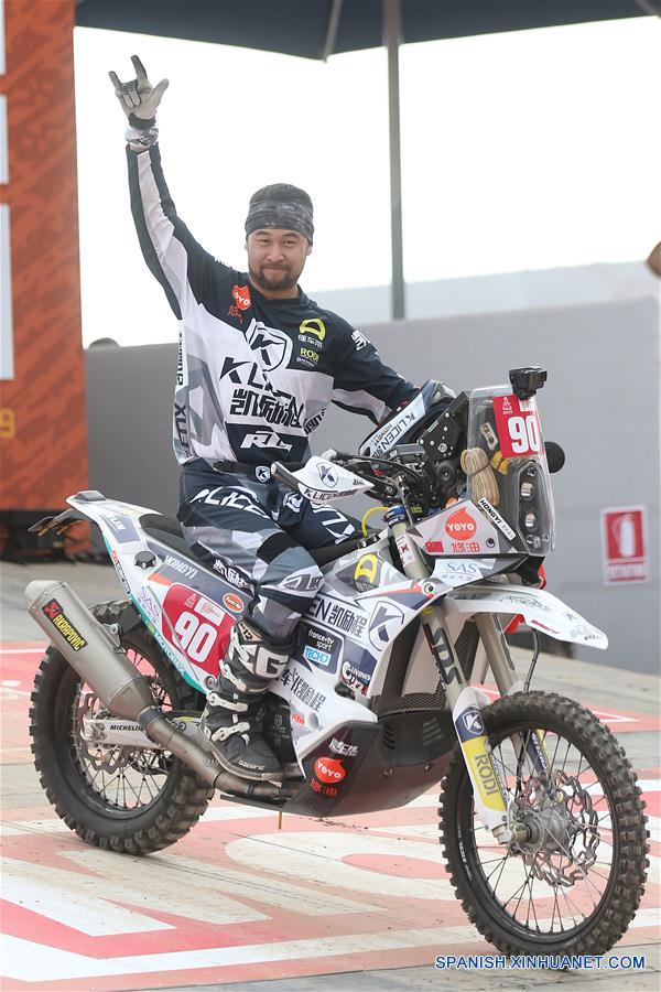 Imagen del 6 de enero de 2019 del piloto chino, Zhao Hongyi, retirándose del podio durante la ceremonia de salida del Rally Dakar 2019, en Lima, Perú. La 41 edición del Rally Dakar comenzó en Lima, Perú. (Xinhua/Li Ming)