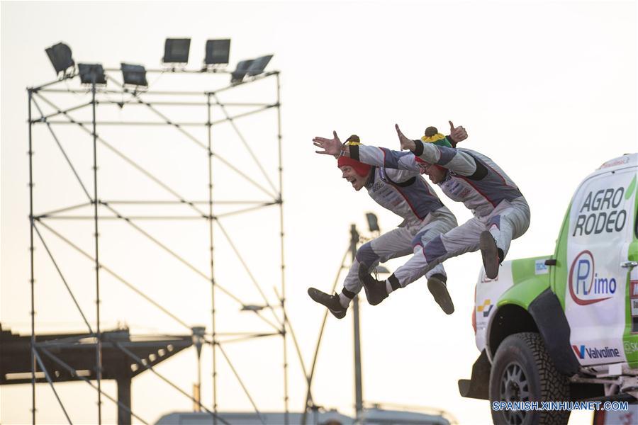 Imagen del 6 de enero de 2019 del piloto lituano, Vaidotas Zala (i) y su copiloto Saulius Jurgelenas, del equipo Agrorodeo, brincando en el podio durante la ceremonia de salida del Rally Dakar 2019, en Lima, Perú. La 41 edición del Rally Dakar comenzó en Lima, Perú. (Xinhua/Li Ming)
