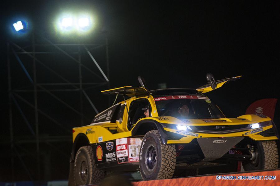 Imagen del 6 de enero de 2019 del piloto chino, Han Wei (d) y su copiloto Liao Min, del equipo Geely Auto conducen en el podio durante la ceremonia de salida del Rally Dakar 2019, en Lima, Perú. La 41 edición del Rally Dakar comenzó en Lima, Perú. (Xinhua/Li Ming)