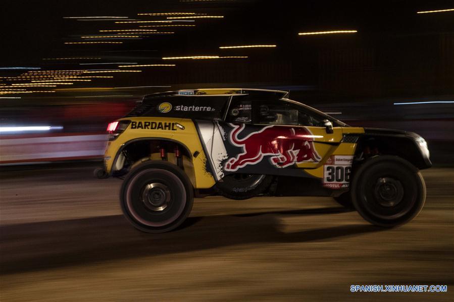 Imagen del 6 de enero de 2019 del piloto francés, Sebastien Loeb y su copiloto de Mónaco, Daniel Elena, se retiran durante la ceremonia de salida del Rally Dakar 2019, en Lima, Perú. La 41 edición del Rally Dakar comenzó en Lima, Perú. (Xinhua/Li Ming)