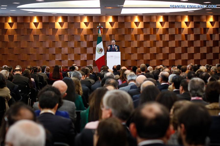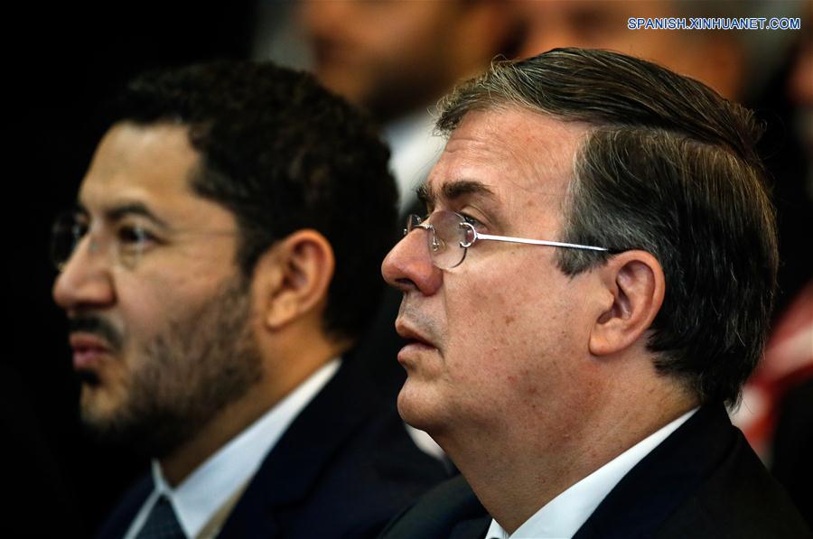 Marcelo Ebrard Casaubón (d), secretario de Relaciones Exteriores de México, reacciona durante la ceremonia de inauguración de la XXX Reunión Anual de Embajadores y Consules en la Ciudad de México, capital de México, el 7 de enero de 2019. De acuerdo con información de la prensa local, Marcelo Ebrard Casaubón pidió a la diplomacia mexicana redise?ar la política exterior, además de no intervenir en la diplomacia entre países y el respeto entre las naciones. (Xinhua/Francisco Ca?edo)