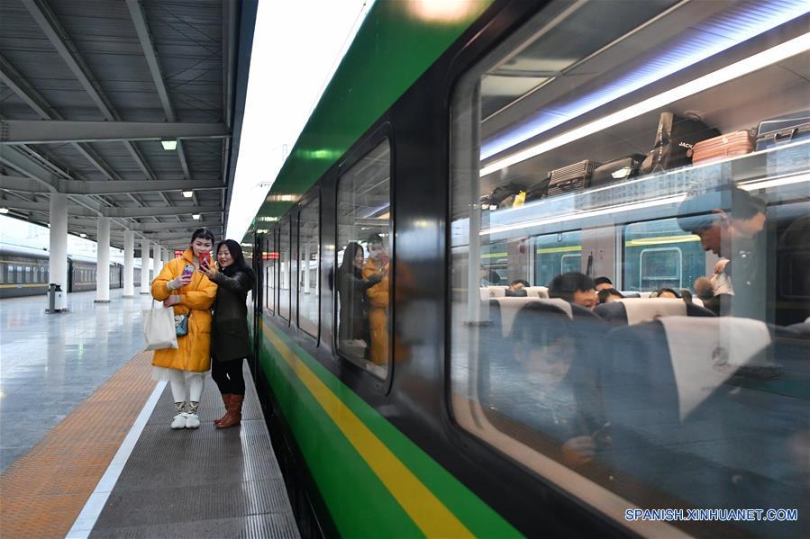 Personas se toman una "selfie" previo abordar un tren en Lanzhou, capital de la provincia Gansu, en el noroeste de China, el 8 de enero de 2019. El primer tren bala Fuxing con una velocidad de 160 kilómetros por hora empezó operaciones el martes en la línea Lanzhou-Chongqing. (Xinhua/Chen Bin)