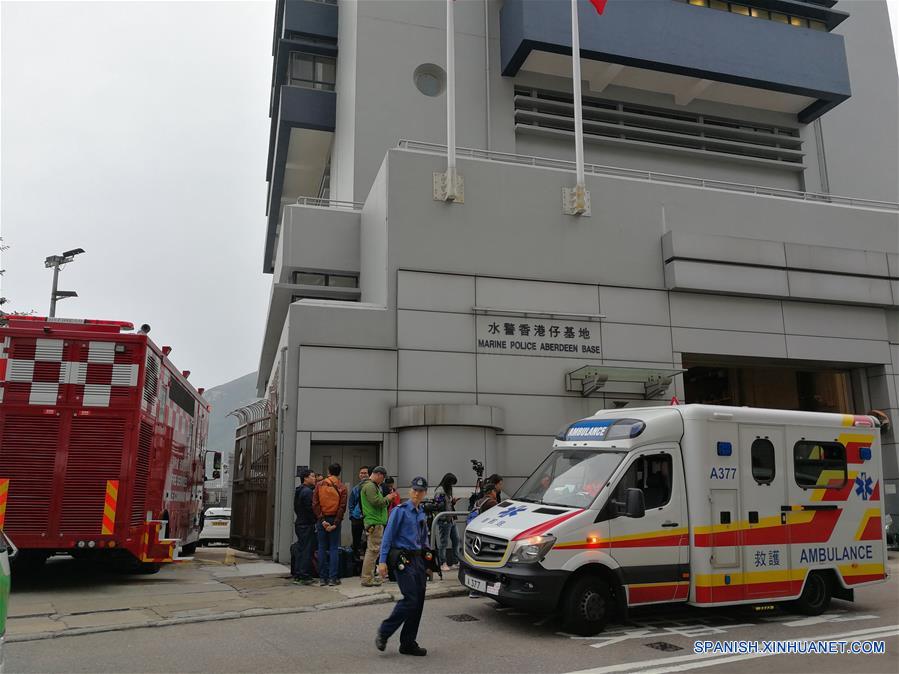 Rescatistas y trabajadores de los medios de comunicación esperan frente a la Base de la Policía Naval Aberdeen en Hong Kong, al sur de China, el 8 de enero de 2019. Una persona murió, siete resultaron heridas y dos están desaparecidas luego de que un buque petrolero explotó y se incendió el martes frente a la isla de Lamma de Hong Kong. El accidente ocurrió alrededor de las 11:29 hora local (03:29 GMT) cuando los tripulantes del buque de 140 metros de eslora estaban tratando de conectar las tuberías con una barcaza para reabastecer al buque de combustible frente a la isla de Lamma, dijo Yiu Men Yeung, comandante de la división de marina e inmersión del Departamento de Servicio Contra Incendios (FSD, por sus siglas en inglés) del gobierno de la Región Administrativa Especial de Hong Kong (RAEHK). (Xinhua/Wu Xiaochu)