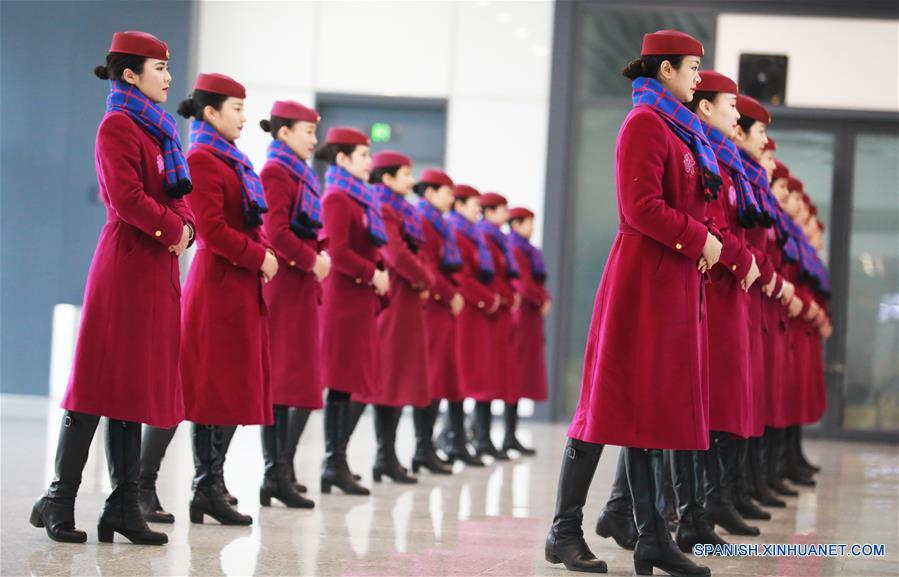 Asistentes de viaje reciben entrenamiento de etiqueta, en Chongqing, en el suroeste de China, el 8 de enero de 2019. Los empleados de la compa?ía China Railway Chengdu Group Co., Ltd. están ocupados preparándose para la temporada alta de viajes del Festival de la Primavera anual, que se espera dure del 21 de enero al 1 de marzo de 2019. (Xinhua/Wang Quanchao)