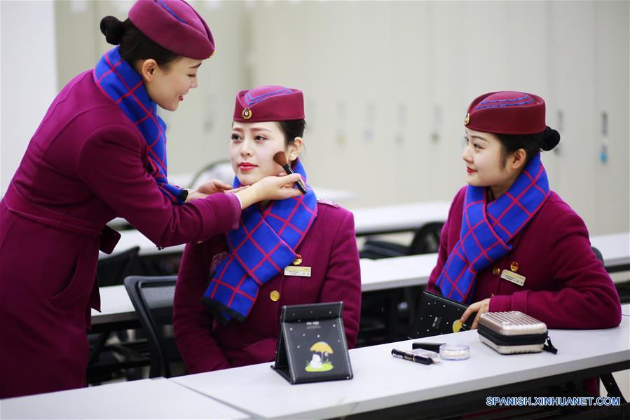 Asistentes de viaje reciben entrenamiento de etiqueta, en Chongqing, en el suroeste de China, el 8 de enero de 2019. Los empleados de la compa?ía China Railway Chengdu Group Co., Ltd. están ocupados preparándose para la temporada alta de viajes del Festival de la Primavera anual, que se espera dure del 21 de enero al 1 de marzo de 2019. (Xinhua//Su Zhigang)